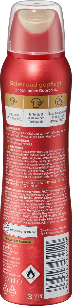 С парфюмерным дезодорантом Glamorous Moment от Balea защита дезодоранта-спрея в сочетании с ароматом чарующих духов. Веганская формула сочетает в себе цветочные нюансы с восточными нотками и обеспечивает стойкий аромат по всему телу. Кроме того, спрей не оставляет белых следов и обеспечивает оптимальную дезодорирующую защиту. Рецептура без микропластика и водорастворимых, чисто синтетические полимеры.
