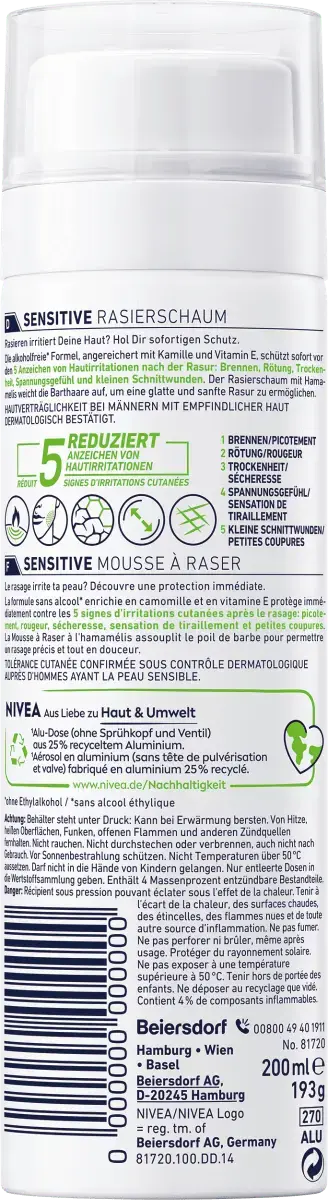 С пенкой для бритья NIVEA MEN Sensitive вы сможете добиться гладкого бритья, несмотря на чувствительную кожу лица. Пена для бритья без этилового спирта защищает кожу от раздражений, таких как неприятное жжение, ощущение напряжения и покраснения. Мягкая формула с ромашкой и витамином Е успокаивает чувствительную мужскую кожу. Пена для бритья смягчает жесткие волосы бороды, а инновационная технология Ultra Glide позволяет лезвиям бритвы мягко и нежно скользить по коже. Благодаря пене для бритья кожа лица надежно защищена от мелких порезов. Для невероятно точного результата и ухоженной кожи.