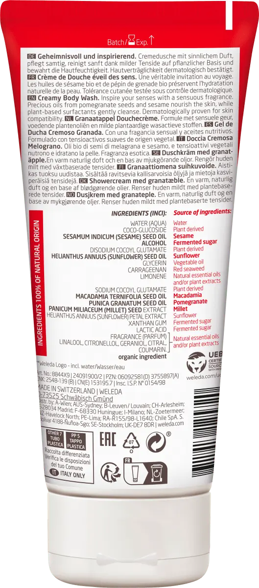 Описание продукта Питает Вдохновляет чувства Таинственный и вдохновляющий чувственным ароматом: Гранатовый крем-душ Weleda обеспечивает бархатистый уход, нежно очищает благодаря мягким поверхностно-активным веществам растительного происхождения и сохраняет влагу в коже. Совместимость с кожей подтверждена дерматологически. Номер изделия dm: 243367 Информация об экологичности продукта Этот продукт имеет сертификат или печать экологического или устойчивого развития. С помощью этой информации об устойчивом развитии мы хотели бы облегчить вам более осознанное (экологическое) потребление. Сертификаты/печати мы подбирали совместно с NABU (Ассоциация охраны природы Германии). Подробнее о печатях и сертификатах Ингредиенты Состав (INCI): Вода (Aqua), Коко-глюкозид, Масло семян Sesamum Indicum (Кунжут)+, Алкоголь+, Кокоилглутамат динатрия, Масло семян Helianthus Annuus (Подсолнечник)+, Глицерин, Каррагинан, Лимонен, Кокоилглутамат натрия, Масло семян Macadamia Ternifolia+, Масло семян Punica Granatum+, Экстракт семян Panicum Miliaceum (просо)+, Экстракт лепестков Helianthus Annuus (подсолнечника), ксантановая камедь, молочная кислота, ароматизатор (парфюм), линалоол, цитронеллол, гераниол, цитраль, кумарин. +органический ингредиент Инструкция по применению Питает и пробуждает чувства Аромат, словно из «Тысячи и одной ночи». Гранатовый душ красоты пробуждает чувства экзотическим женственным ароматом апельсина, даваны и ванили. Ценные масла семян граната и кунжута придают коже бархатистость, сохраняют ее естественную влагу и защищают от высыхания. Мягкие ПАВ на основе растительного сырья бережно очищают кожу. Применение: Применение: - Питает ценными маслами, придавая коже ощущение бархатистости - Сохраняет влагу кожи и защищает ее от высыхания
