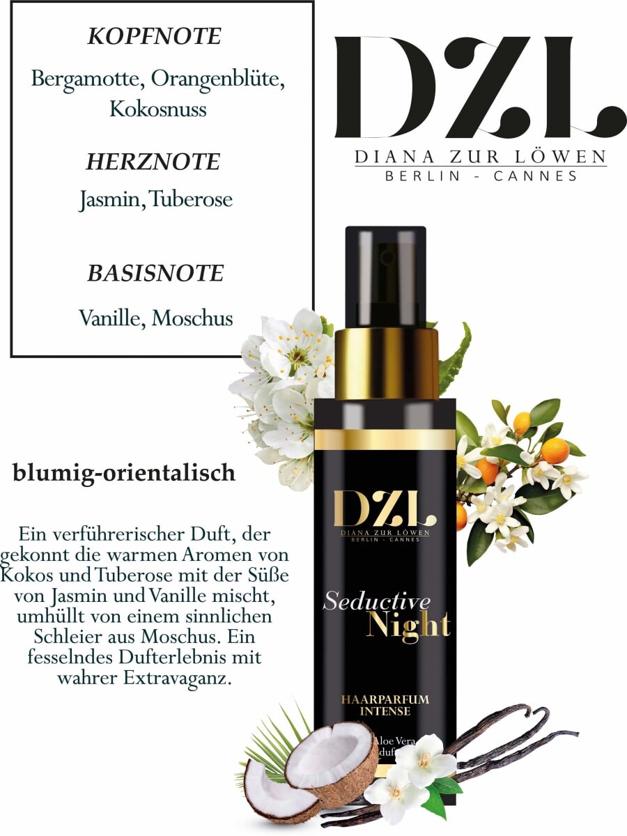 >Интенсивный парфюм для волос от DZL с ароматом Seductive Night придает волосам соблазнительный и стойкий аромат. Теплые ароматы кокоса и туберозы сочетаются со сладостью жасмина и ванили и окутываются чувственной вуалью мускуса. Формула с органическим экстрактом алоэ вера обеспечивает устойчивый уход за волосами и, следовательно, бархатистость и блеск шевелюры.
