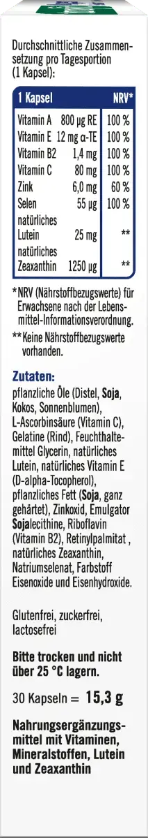 СоставСуточная доза*% NRV**Витамин B 2, Рибофлавин1,4 мг100%Селен55 мкг100 %Витамин А800 мкг100%Витамин С80 мг100%Витамин Е12 мг100%Цинк6 мг60%Лютеин25 мг****Зеаксантин1,250 мкг*****соответствует 1 шт.