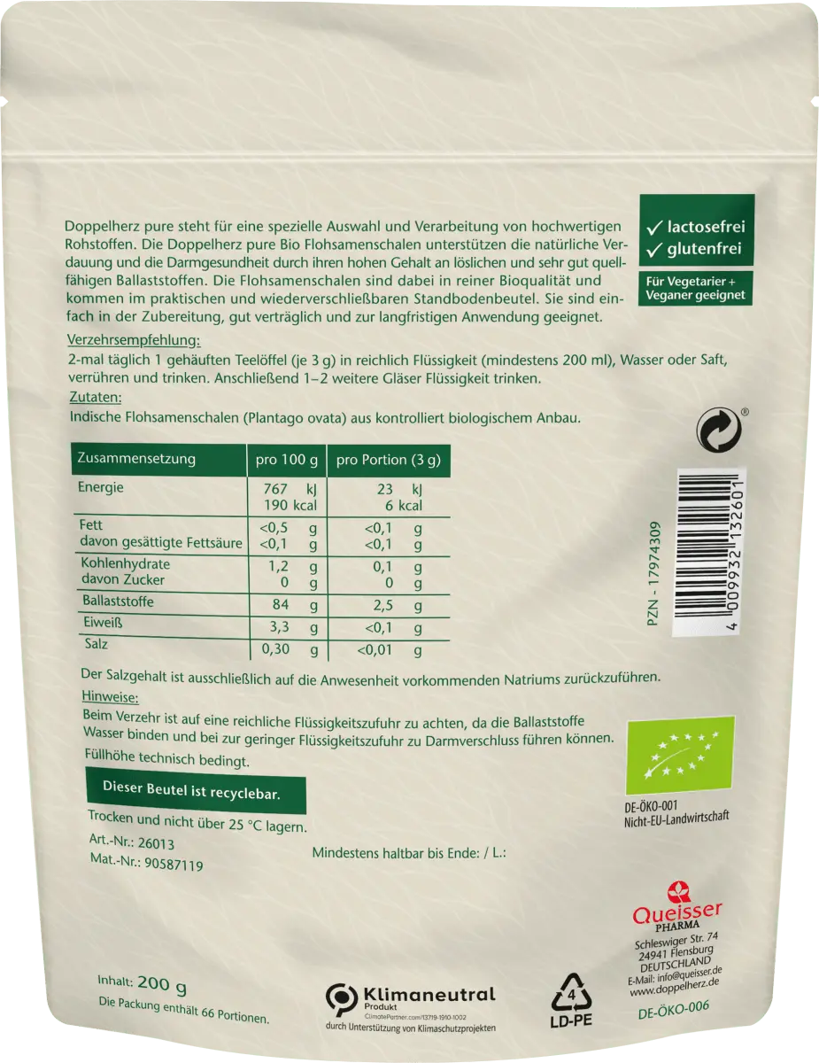 >Чистая шелуха подорожника Doppelherz – это результат специального отбора и обработки высококачественного сырья. Чистая органическая шелуха подорожника от Doppelherz поддерживает естественное пищеварение и здоровье кишечника благодаря высокому содержанию растворимой и хорошо набухающей клетчатки. Шелуха псиллиума имеет чистое органическое качество и поставляется в практичной закрывающейся сумке-стойке. Их легко приготовить, они хорошо переносятся и подходят для длительного применения.