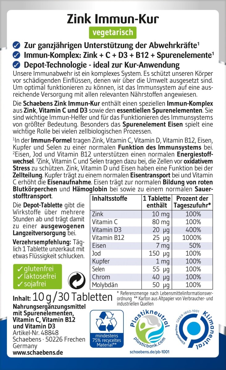 Имунный препарат Zinc + C + D3 + B12 от Schaebens содержит специальную комбинацию витаминов и микроэлементы. Благодаря специальному эффекту депо активные ингредиенты высвобождаются в организм в течение длительного периода времени, а это означает, что в день необходимо принимать только одну таблетку. Для поддержки нормальной функции иммунной системы круглый год с помощью цинка и витаминов С, Д3 и В12.