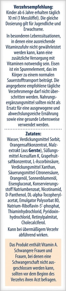 Рекомендуемый расход: Дети в возрасте Дети 6 лет и старше получают 10 мл в день (1 мерная ложка). Такая же дозировка применяется для подростков и взрослых. Рекомендуемая суточная доза не должна превышаться. Диетические добавки не должны использоваться в качестве замены сбалансированного и разнообразного питания и здорового образа жизни. Продукт содержит витамин А. Перед употреблением беременным женщинам следует проконсультироваться с врачом. Избегайте приема других пищевых добавок, содержащих витамин А. При чрезмерном употреблении может оказывать слабительное действие.
