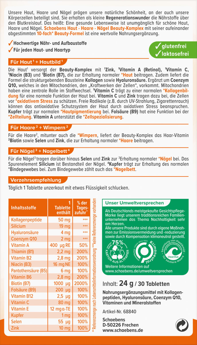 Комплекс красоты «Кожа, волосы, ногти» от Schaebens вместе с выбранными ингредиентами. Диетическая добавка содержит, среди прочего, витамин С, который способствует нормальному образованию коллагена для нормального функционирования кожи, а также коллаген, ретинол, медь и селен, которые способствуют поддержанию нормальных волос и ногтей.