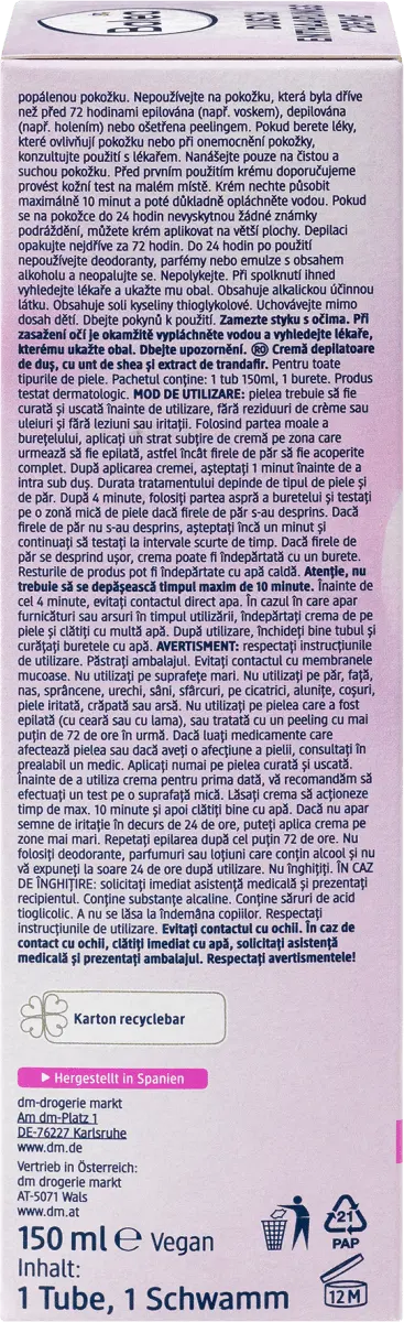 Перед использованием кожа должна быть чистой и сухой, без остатков других продуктов. такие как кремы, масла и т. д. и без травм и раздражений. Мягкой стороной губки нанесите тонкий слой крема на участок, подлежащий депиляции, так, чтобы волосы были полностью покрыты. После нанесения крема подождите 1 минуту, прежде чем принять душ. Время воздействия зависит от типа кожи и волос. Через 4 минуты грубой стороной губки проверьте небольшой участок кожи, чтобы убедиться, что волосы уже выбились. Если волосы не выпали, подождите еще минуту и продолжайте тестирование через короткие промежутки времени. Если волосы легко отрываются, остатки крема можно удалить спонжем. Остатки крема можно удалить теплой водой. Обратите внимание, что время воздействия не должно превышать 10 минут. Во избежание смывания крема раньше, чем через 4 минуты, следует избегать прямого контакта со струей воды. Если во время нанесения возникает покалывание или жжение, средство следует снять непосредственно с кожи и смыть большим количеством воды. После использования снова плотно закройте тюбик и промойте губку водой.