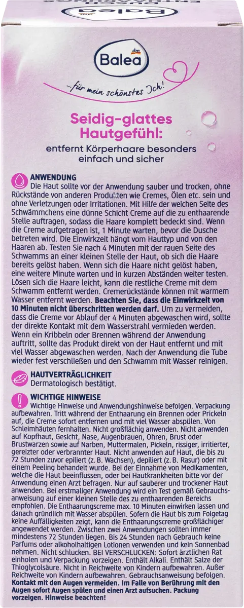 Используйте крем для депиляции Balea, чтобы быстро и легко удалить нежелательные волосы. Его особенно удобно использовать в душе, что экономит время. Крем подходит для всех типов кожи и обогащен маслом ши и экстрактом розы.