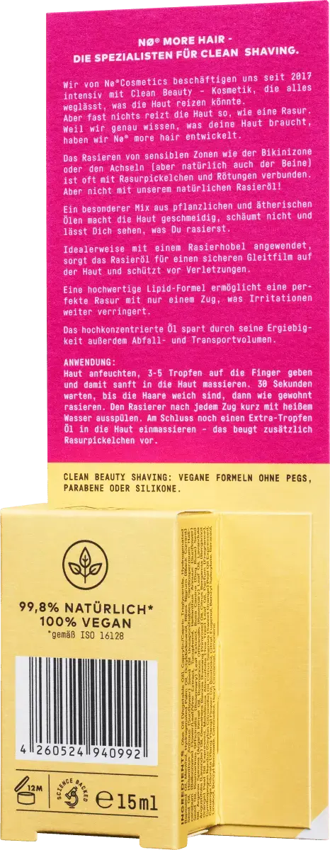 The Nø More Масло для бритья Clean Shave от Nø Cosmetics — веганский и натуральный продукт, специально разработанный для бережного бритья подмышек, интимных зон и ног. Благодаря высокоэффективной формуле масло эффективно помогает предотвратить порезы, раздражение и покраснение кожи. Сертификат Clean Beauty гарантирует, что масло для бритья не содержит микропластика, минеральных масел, силиконов, парабенов, ПЭГ, сульфатов и спирта, что означает, что оно чрезвычайно безопасно для кожи. Простое использование масла – всего 3–5 капель на тщательное бритье – обеспечивает результат, который сохраняется до трех дней, что не только экономит время, но и бережно воздействует на кожу. Компактный флакон объемом 15 мл идеально подходит для путешествий, его можно легко взять с собой в ручную кладь или спортивную сумку. Nø Cosmetics выступает за устойчивое развитие в индустрии красоты и сознательно избегает вредных ингредиентов и экологически вредных упаковочных материалов. Это масло для бритья Nø Cosmetics предлагает эффективную, нежную и экологически чистую альтернативу традиционным вариантам бритья, которая может революционизировать ваш ежедневный уход.