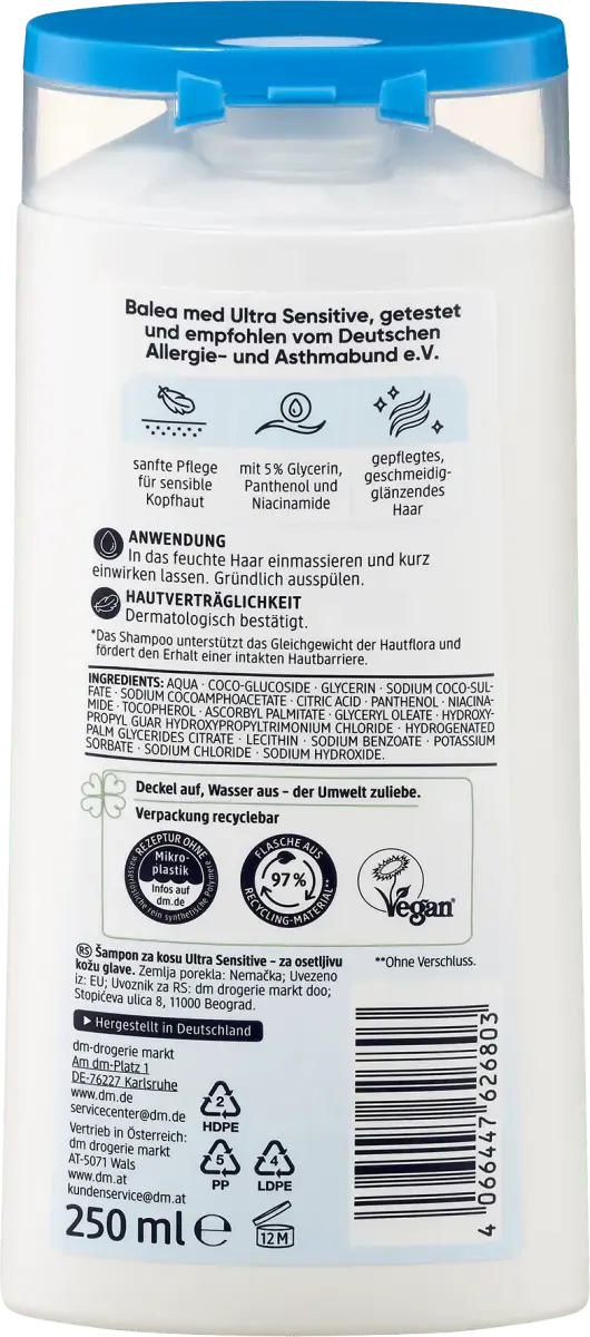 Шампунь Balea Med Ultra Sensitive протестирован и рекомендован Немецкой ассоциацией по борьбе с аллергией и астмой. Он обеспечивает нежный уход за чувствительной кожей головы благодаря содержанию 5% глицерина, пантенола и ниацинамида. Для ухоженных, эластичных, блестящих волос. Шампунь поддерживает баланс флоры кожи и способствует поддержанию неповрежденного кожного барьера.
