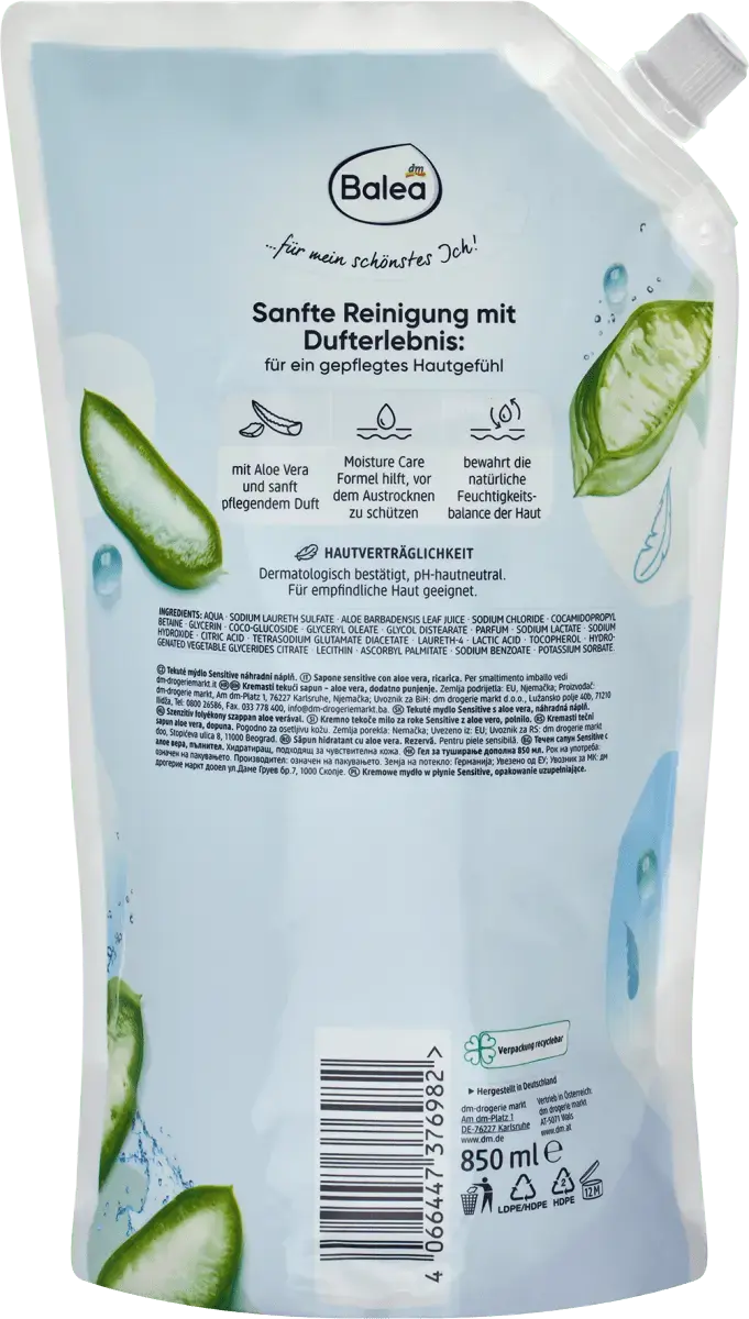 Запасной блок крем-мыла Balea Sensitive с алоэ вера и нежным питательным ароматом сохраняет естественный баланс влаги в коже. Формула Moisture Care защищает от высыхания. Рецепт без микропластика и водорастворимых, чисто синтетических полимеров.