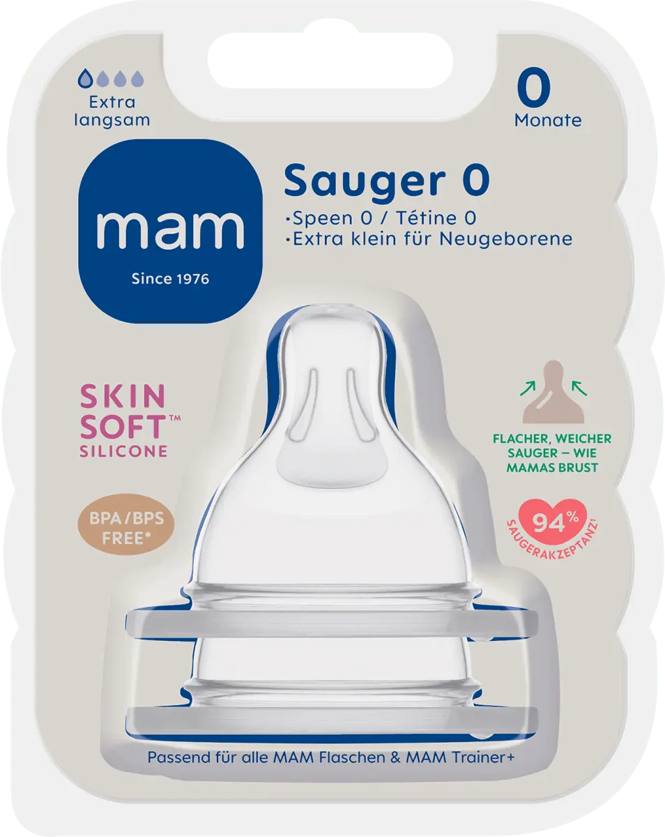 Силиконовая соска MAM размера 0 с рождения особенно подходит для особых потребностей новорожденных, поскольку она адаптирована к материнской груди и, таким образом, облегчает питье. Он изготовлен из специального силикона MAM SkinSoft, который особенно мягкий и приятный на ощупь во рту ребенка. Соску принимают 94% детей.* Особая форма соски и структурные полоски предотвращают ее разрушение во время питья и обеспечивают приятные ощущения от питья. Соски MAM подходят ко всем бутылочкам MAM с широким горлышком и тренажеру MAM. *Рыночное исследование 2009–2017 гг., протестировано на 1508 младенцах.