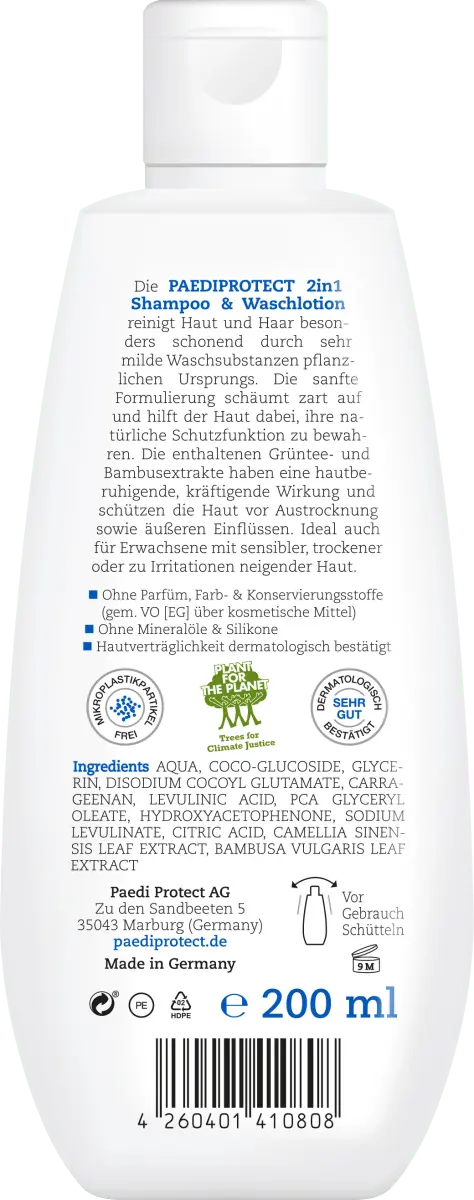 PAEDIPROTECT 2in1 Шампунь и лосьон для мытья очищает кожу и волосы особенно бережно с использованием очень мягких моющих веществ растительного происхождения. Нежная формула мягко пенится и помогает коже сохранять естественную защитную функцию. Содержащиеся в нем экстракты бамбука и зеленого чая оказывают успокаивающее действие и защищают кожу от пересыхания и внешних воздействий. Он также идеально подходит для взрослых с чувствительной, сухой или склонной к раздражению кожей.