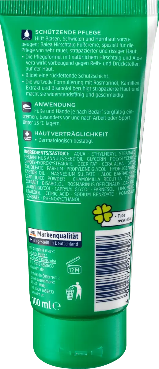 Крем для ног Balea с оленьим жиром специально разработан для ухода за очень грубой, стрессовой и потрескавшейся кожей и помогает предотвратить появление волдырей, мозолей и мозолей. Формула ухода с натуральным оленьим жиром и алоэ вера также предотвращает трение и давление на кожу и образует увлажняющий защитный слой. Ценная формула с маслом розмарина, экстрактом ромашки и бисабололом успокаивает стрессовую кожу, делает ее упругой и эластичной.