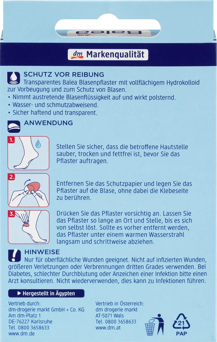 Прозрачная смесь пузырчатой ​​штукатурки Balea с гидроколлоидом по всей поверхности подходит для профилактики и защиты против волдырей на ногах. Пластыри-блистеры впитывают жидкость, образующуюся при волдырях, и оказывают амортизирующее действие.