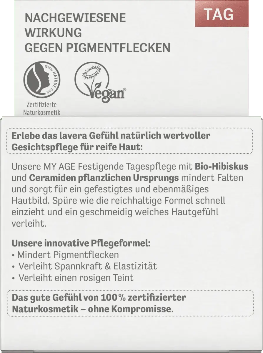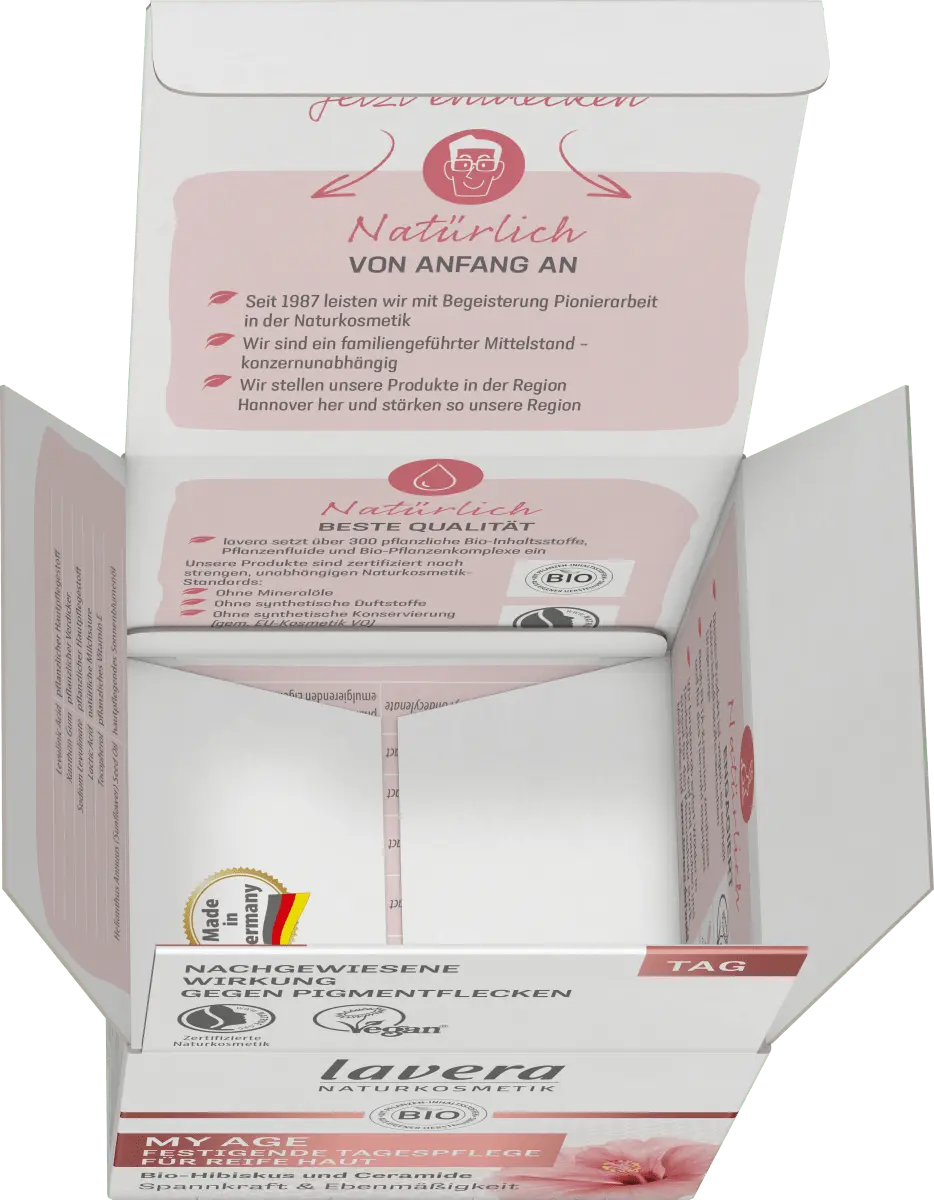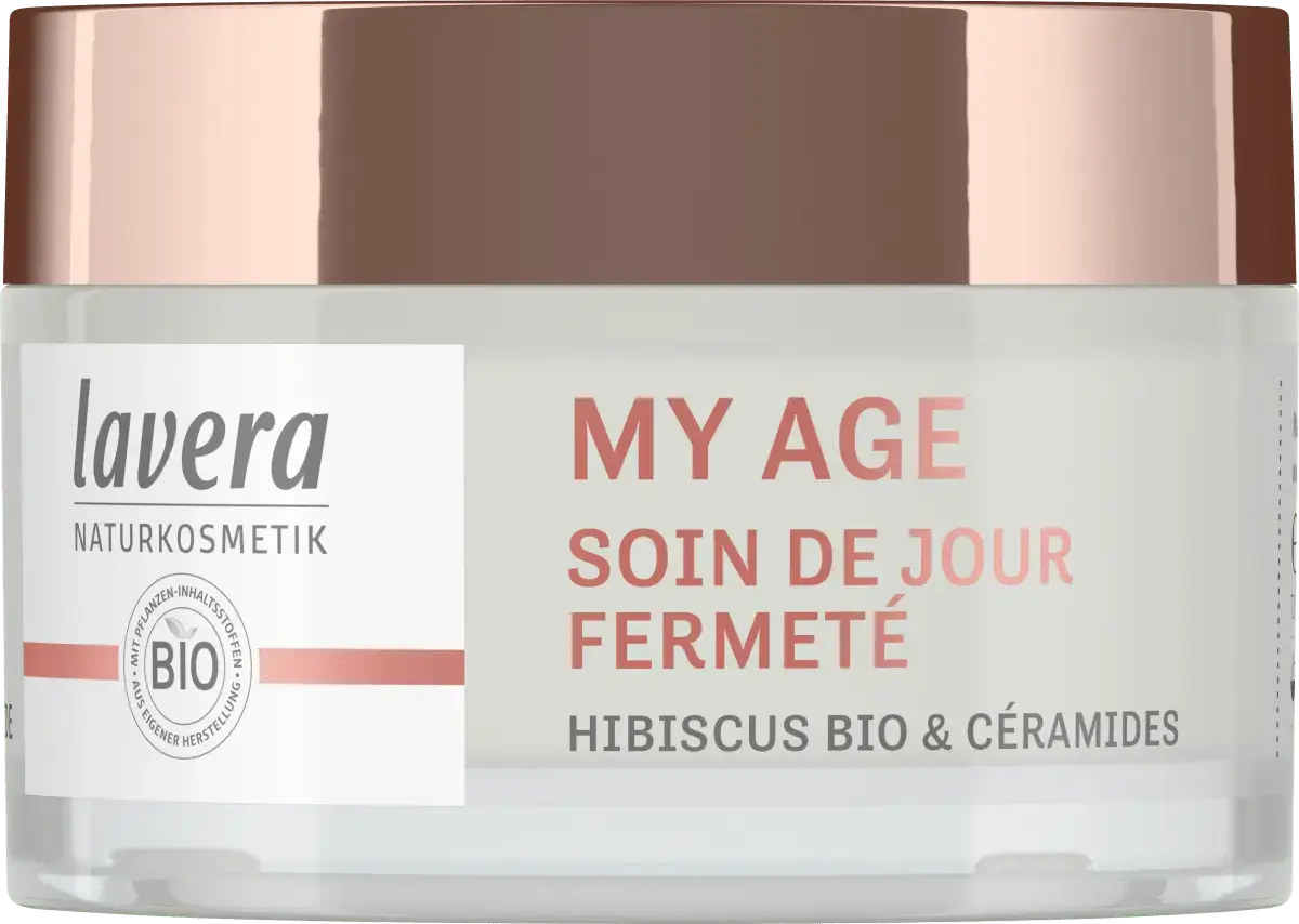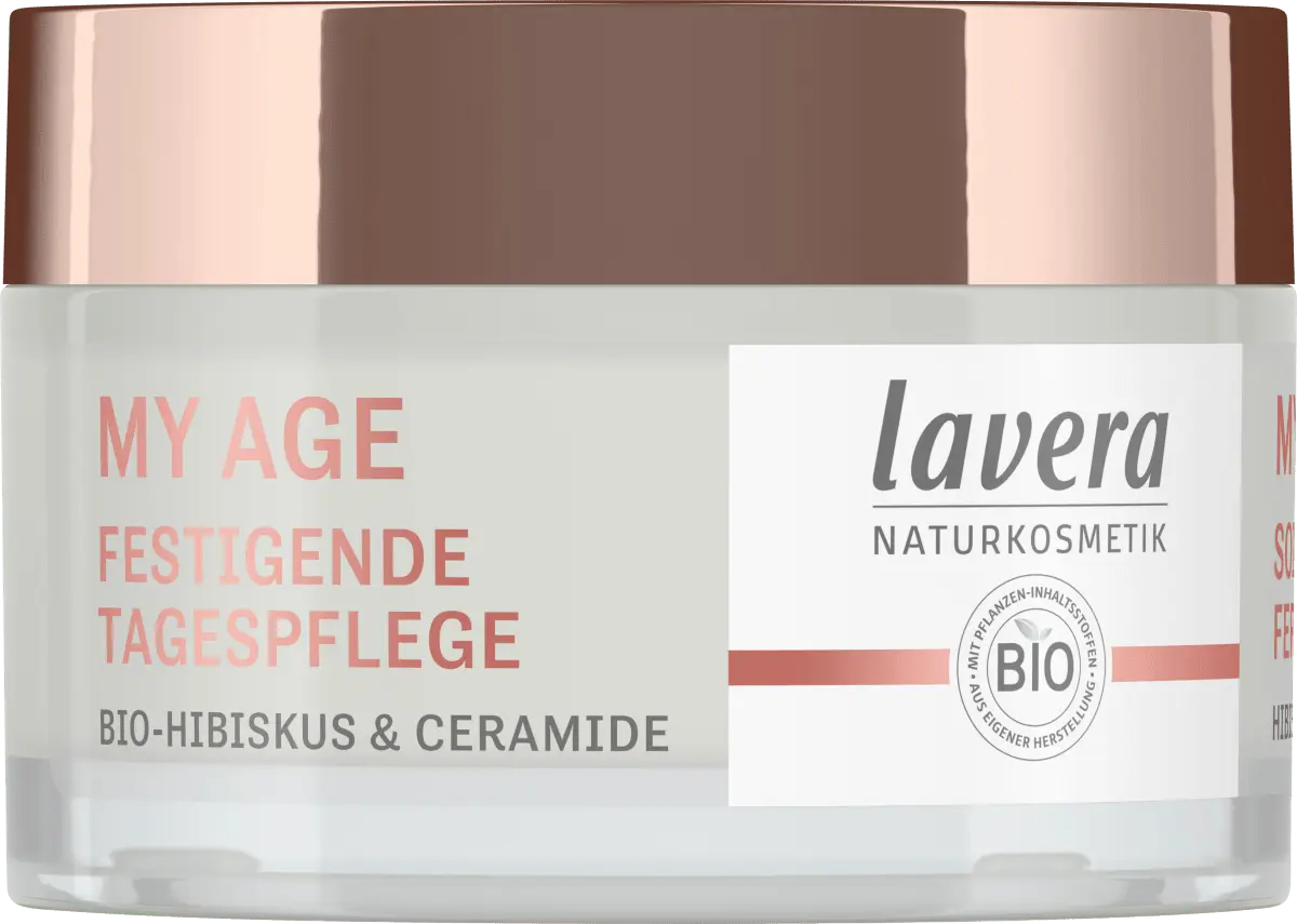 Дневной крем My Age от Lavera представляет собой сбалансированную натуральную композицию с органическим гибискусом и керамидами. растительного происхождения. Благодаря богатой формуле он быстро впитывается, придает коже ощущение эластичности и мягкости, а также обеспечивает упругость и ровный цвет лица. Также уменьшает морщины и пигментные пятна, придает тонус, эластичность и румяный цвет лица. Он содержит ингредиенты, полученные из контролируемого органического выращивания, но не содержит жидких микропластиков и искусственных консервантов. *Упаковка содержит не менее 70 % переработанного материала.