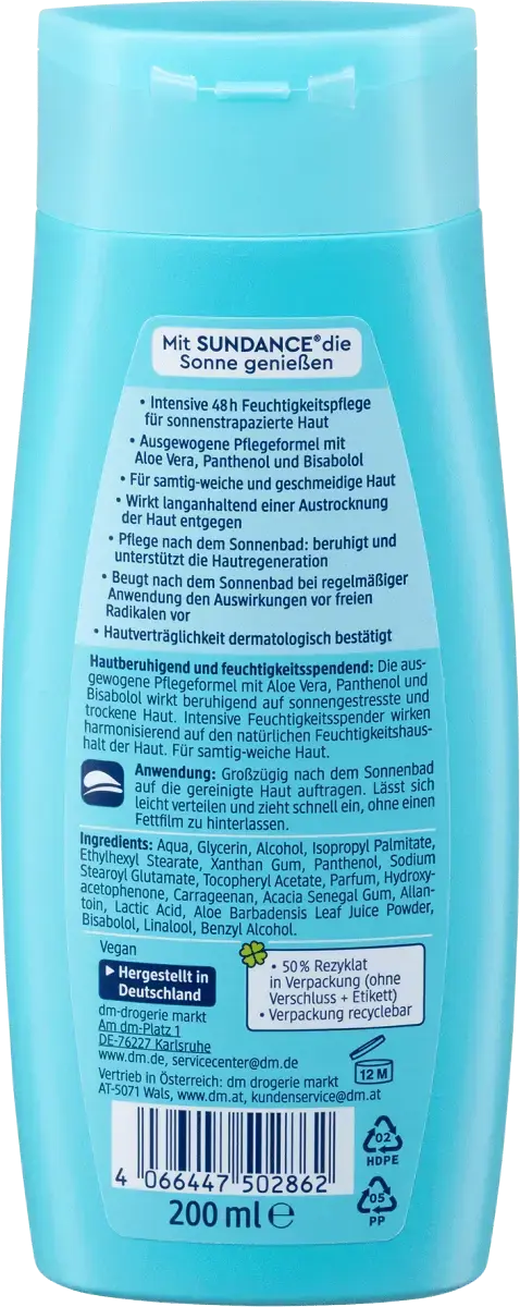 Лосьон после загара от SUNDANCE – увлажняющее средство по уходу за кожей, подвергшейся солнечному стрессу. Обладает длительным действием против пересыхания кожи. Лосьон после загара – регенерирующее и успокаивающее средство для ухода за кожей. При регулярном использовании после принятия солнечных ванн предотвращает воздействие свободных радикалов. Совместимость с кожей подтверждена дерматологически.