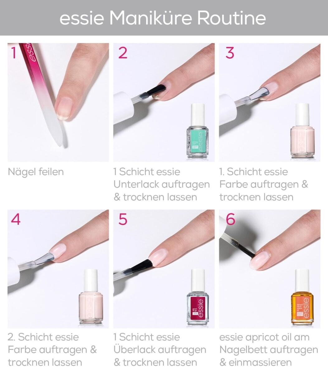 Тщательно очистите ногти перед маникюром и аккуратно удалите остатки лака с помощью жидкости для снятия лака. Затем на очищенные ногти следует нанести базовое покрытие для непрозрачного лака, чтобы результат цвета мог проявиться оптимально. Затем нанесите один за другим два слоя высококачественного лака для ногтей от essie и дайте каждому высохнуть. Наконец, для закрепления маникюра в домашних условиях следует использовать верхнее покрытие, чтобы ногти были идеально гладкими и прочными. При необходимости используйте также масло для ногтей, чтобы сохранить эластичность кутикулы.