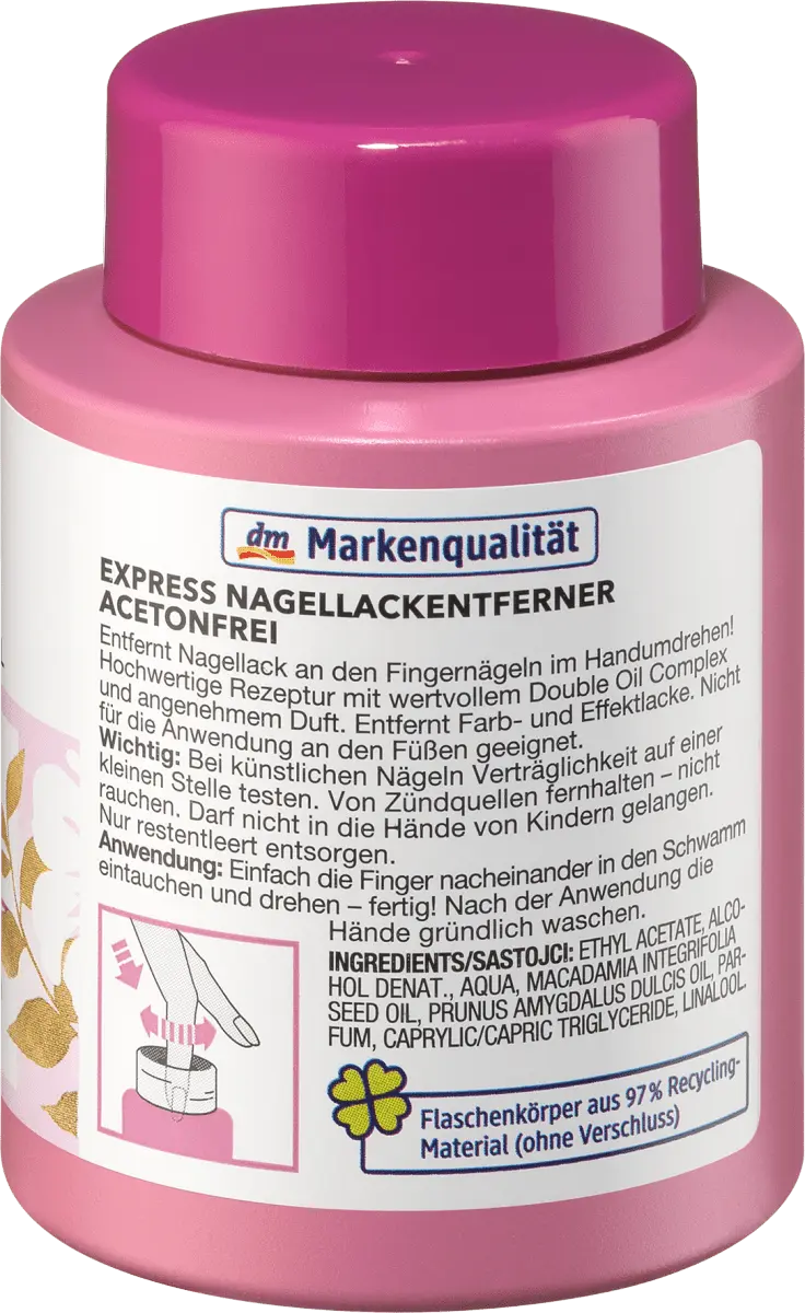 Не содержит ацетона Жидкость для снятия лака Professional Express от ebelin удаляет лак с ногтей в кратчайшие сроки. Он также впечатляет своей высококачественной формулой с ценным двойным масляным комплексом и приятным ароматом. Также удаляет цветные и эффектные лаки, но не подходит для ухода за ногами. *Упаковка содержит не менее 70 % переработанного материала.