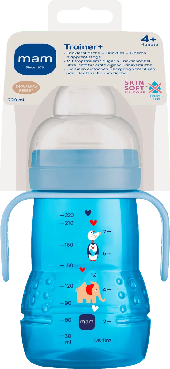 Обучающая бутылочка MAM Trainer+ 220 мл для детей от 4 месяцев синего цвета с мотивом слона способствует легкому переходу от грудного вскармливания или кормления из бутылочки к чашке для питья. Практичный набор MAM Trainer+ включает в себя соску MAM без капель, ультрамягкий носик для питья MAM и ручку для бутылочки MAM Hold My Bottle. Таким образом, ваш ребенок шаг за шагом научится пить самостоятельно. 1-й шаг: Соска MAM без капель облегчает переход от грудного вскармливания к бутылочке или Trainer+. Благодаря щелевидному отверстию из него не капает, и ребенок может самостоятельно контролировать поток питья. 2-й шаг: благодаря сверхмягкому носику для питья, не допускающему капель, переход от грудного вскармливания или кормления из бутылочки к чашке становится особенно простым. Излив для питья не имеет клапана и благодаря прорези не пропускает капли. Хитрость: симметричные соски и носики для питья от MAM имитируют мамину грудь во время питья благодаря своей натуральной поверхности SkinSoft, а плоская форма и особенно мягкий силикон кажутся знакомыми.