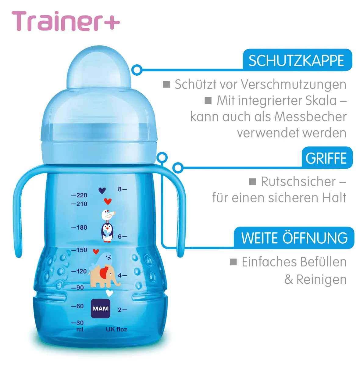 Перед первым использованием: Разберите продукт на все отдельные части и очистите его перед первым использованием. Затем поместите отдельные части в кипящую воду на 5 минут. Это необходимо для обеспечения гигиены. Более подробную информацию об очистке смотрите в соответствующем разделе. Очистка: Перед каждым дальнейшим использованием разбирайте изделие на все отдельные части и очищайте их теплой мыльной водой. Из соображений гигиены перед стерилизацией хорошо промойте чистой водой. Не используйте чистящие средства, содержащие вредные ингредиенты, такие как спирт, хлор и/или микропластик. Перед каждым использованием проверяйте все отдельные части Trainer+ и потяните соску/поилку во всех направлениях. При первых признаках повреждения или износа немедленно выбросьте изделие. Для оптимальной очистки Trainer+ НЕОБХОДИМО разобрать на все отдельные части. Чистка в собранном виде может повредить Trainer+. Подходит для мытья в верхнем отделении посудомоечной машины (до 65°C). Предметы могут быть обесцвечены пищей. Это не оказывает негативного влияния на материал. Очищайте мундштук питьевого носика особенно тщательно, чтобы не повредить мембрану. Не используйте абразивные чистящие средства. Используйте только мягкие щетки или мягкие губки. Жесткие щетки для чистки могут поцарапать пластик. Убедитесь, что после очистки на отдельных частях Trainer+ не осталось остатков пищи. Стерилизация: Для оптимальной стерилизации Trainer+ НЕОБХОДИМО разобрать на все отдельные части. Перед стерилизацией очистите все отдельные части Trainer+. После очистки стерилизацию можно проводить следующим образом: стерилизацию паром (электрическую или микроволновую, в зависимости от инструкции производителя), стерилизацию в кипящей воде (не менее 5 минут) или в стерилизующем растворе. Дайте всем отдельным частям остыть после кипячения или стерилизации. Не оставляйте детали (включая соску/носик) в стерилизующем растворе дольше, чем рекомендовано, и не подвергайте их воздействию прямых солнечных лучей или тепла – в противном случае функционирование продукта или соски/носика может быть нарушено. НИКОГДА не стерилизуйте Trainer+ в собранном виде. Это может повредить Trainer+ и деформировать резьбу, скрепляющую Trainer+. Установка соски/поилки: Вставьте соску или поилку в резьбовое кольцо Trainer+ до щелчка. Поместите ручки на горловину Trainer+ и затяните резьбовое кольцо, включая вставленную соску/поилку. Инструкции по нагреву: НИКОГДА не наливайте в Trainer+ кипяток. НИКОГДА не нагревайте и не охлаждайте закрытый Trainer+. Снимите защитный колпачок и соску/носик для питья (с резьбовым кольцом) при нагревании, особенно перед нагреванием в подогревателе для бутылочек или в микроволновой печи. Не перегревайте, так как это может повредить Trainer+. НИКОГДА не помещайте Trainer+ в духовку. Будьте особенно осторожны при разогреве в микроволновой печи. Всегда проверяйте температуру перед кормлением. Чашку для питья нельзя использовать для горячих напитков (с температурой выше 40 °C) Другая важная информация: Не используйте иглу или другие острые предметы для увеличения отверстия соски/носика. Всегда храните Trainer+ в сухом состоянии. Для MAM Trainer+ используйте только соски MAM и симметричные поилки MAM. Газированные напитки влияют на герметичность чашки для питья. Во избежание травм не позволяйте ребенку гулять с Trainer