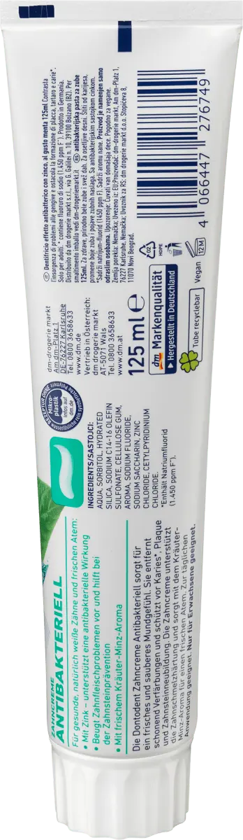 Антибактериальная зубная паста Dontodent нежно воздействует на чувствительные десны и обеспечивает ощущение свежести и чистоты во рту. Он мягко удаляет обесцвечивание, содержит антибактериальный цинк и защищает от кариеса*, образования зубного налета и зубного камня. Зубная паста способствует укреплению зубной эмали и обеспечивает свежесть дыхания своим травяным мятным ароматом. Он подходит для ежедневного использования. Подходит только для взрослых. *содержит фторид натрия (1450 ppm F-) рецептура без микропластика и водорастворимых чисто синтетических полимеров Рецепт зубной пасты без диоксида титана