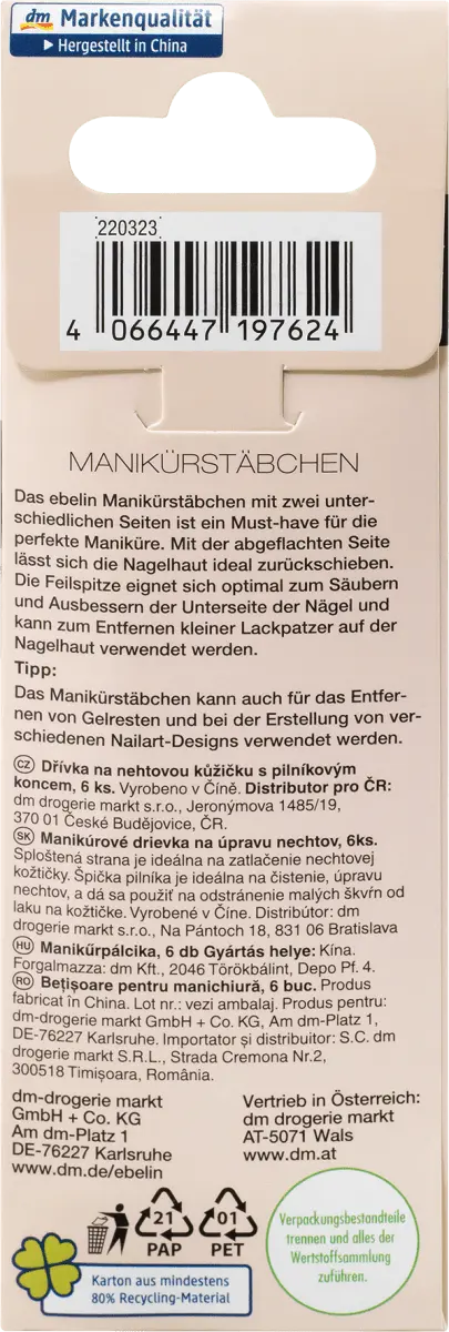 Маникюрная палочка ebelin с кончиком пилочки — практичный инструмент что он должен быть у каждого, кто ценит идеальный маникюр. У палочки две стороны: одна с тонким кончиком пилочки для подкрашивания и подпиливания краев ногтей, а также плоская сторона для отодвигания кутикулы. Наконечник пилочки особенно полезен для сглаживания и исправления небольших дефектов или трещин на ногте. Плоская сторона палочки идеально подходит для аккуратного отодвигания кутикулы, чтобы создать чистое ногтевое ложе и способствовать росту здоровых ногтей.