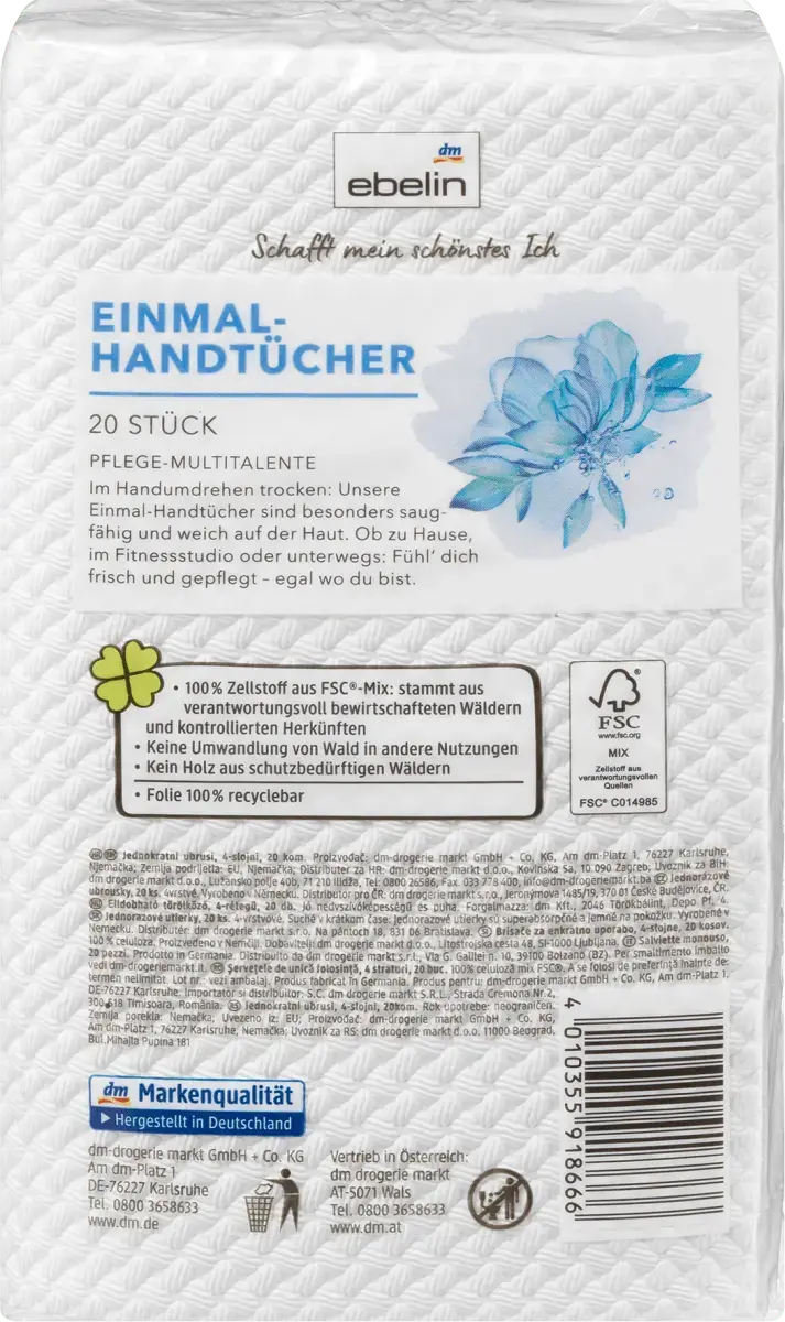Одноразовые полотенца ebelin приятно мягки к коже, бережно и тщательно высушивают ее. Четырехслойные полотенца очень большие и хорошо впитывают влагу — идеально подходят для дома, занятий спортом и путешествий. Они обеспечивают ощущение свежести и ухоженности. Полотенца отбеливаются без хлора.