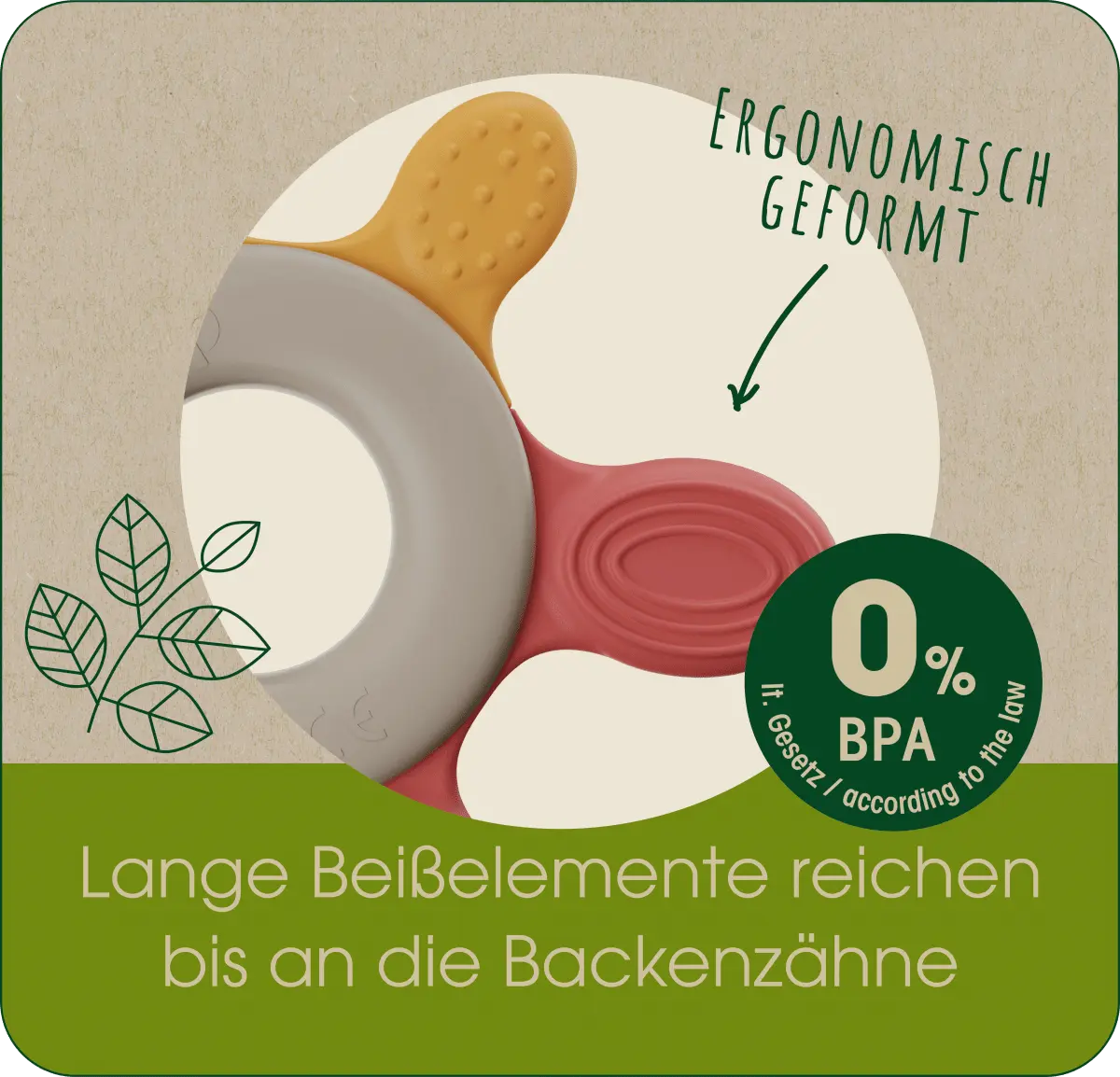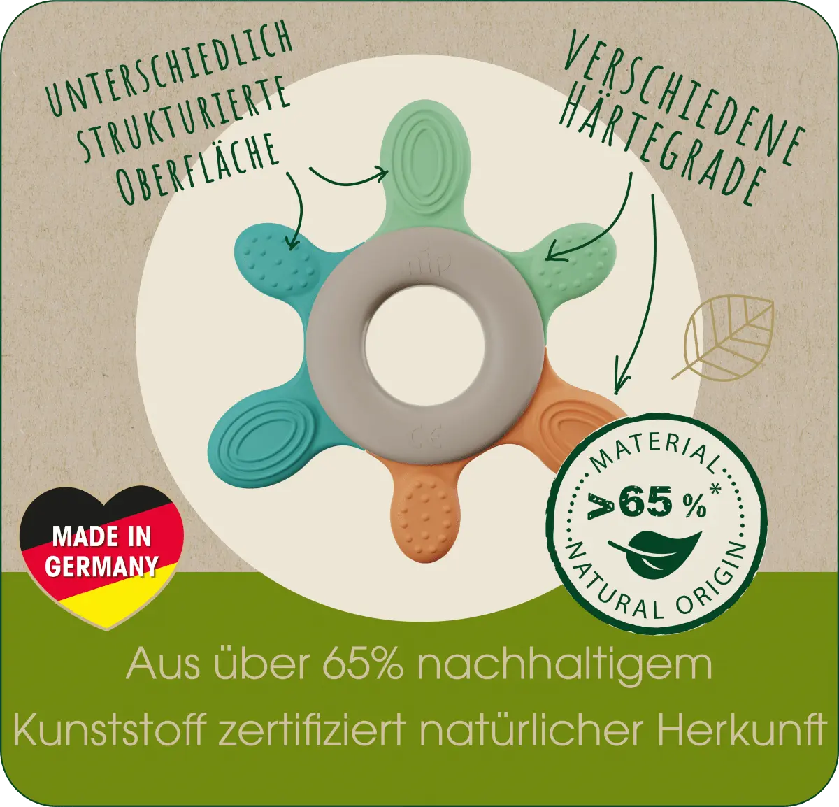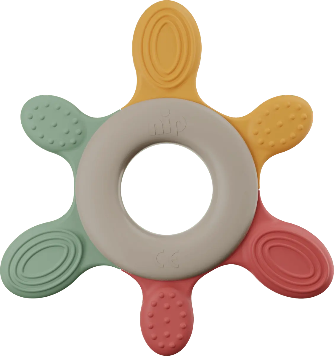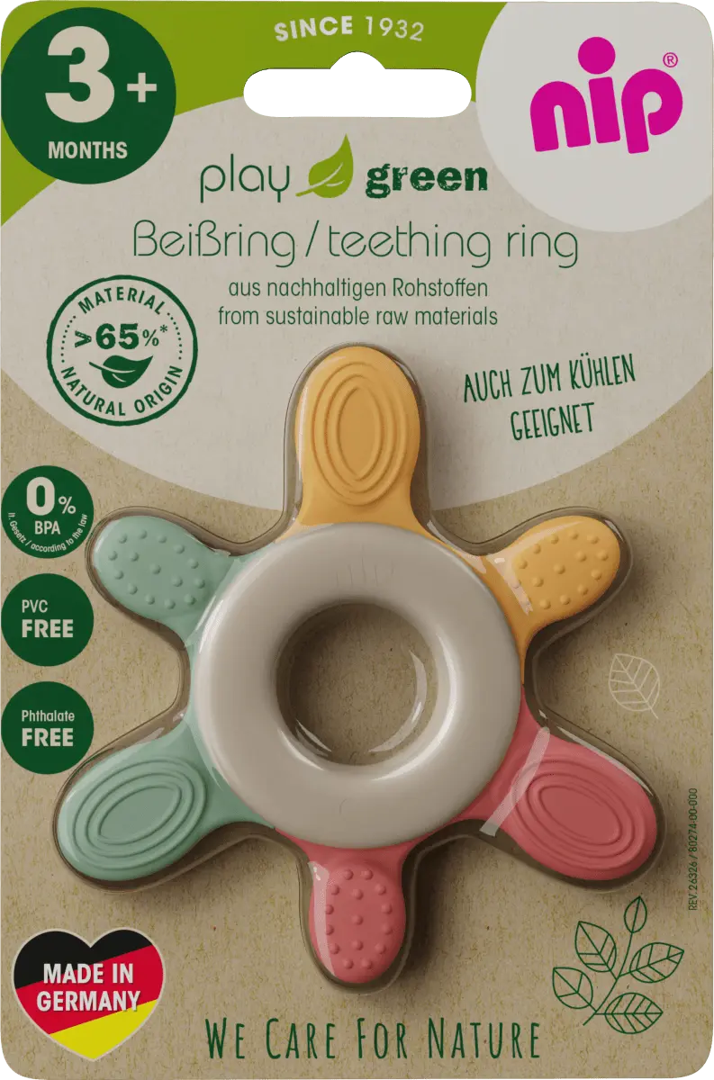 Красное кольцо для прорезывания зубов Play Green от Nip было специально разработано для малышей от 3 месяцев. Благодаря разнообразию материалов с разной степенью твердости кольцо обеспечивает разнообразные впечатления от укуса. Различные структуры поверхности мягко массируют десны и в то же время способствуют ощущению игры и прикосновения. Длинные прикусные элементы доходят даже до коренных зубов.