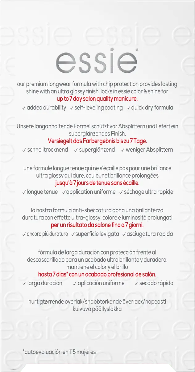 Перед использованием лака для ногтей нанесите слой стойкого верхнего покрытия премиум-класса Stay Longwear на чистые ногти и дайте высохнуть. Теперь нанесите на ногти один или два слоя лака желаемого цвета и дайте ему немного высохнуть. Чтобы защитить цвет от выцветания и продлить его яркость, в завершение нанесите еще один слой стойкого верхнего покрытия премиум-класса от essie и дайте ему высохнуть.