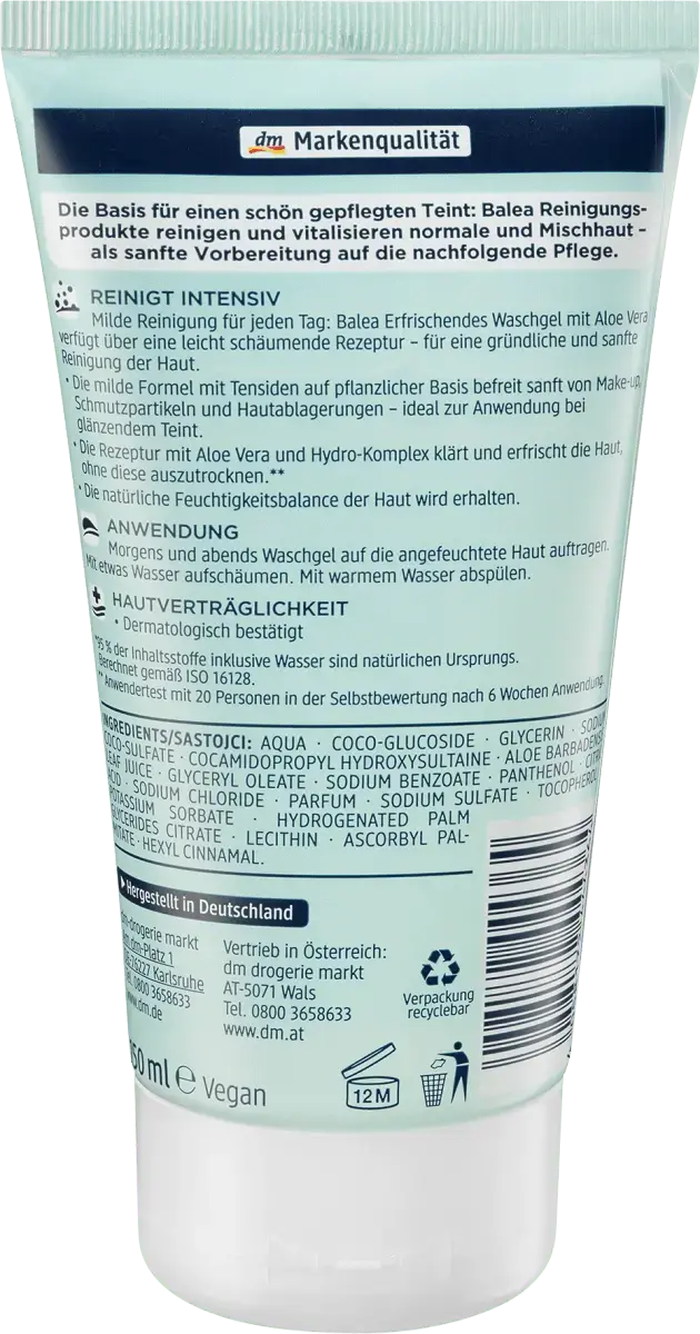 Освежающий гель для умывания от Balea очищает и оживляет нормальную и комбинированную кожу в качестве нежного препарата. для последующего ухода. Освежающий гель для умывания с алоэ вера имеет слегка пенящуюся формулу – для тщательного и мягкого очищения кожи. Мягкая формула с поверхностно-активными веществами растительного происхождения мягко удаляет макияж, частицы грязи и кожные отложения — идеально подходит для сияющего цвета лица. Формула с алоэ вера и гидрокомплексом очищает и освежает кожу, не пересушивая ее. Рецепт без микропластика и водорастворимых, чисто синтетических полимеров.