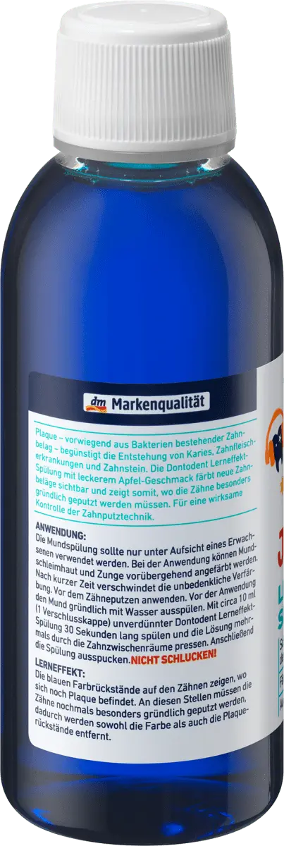 Полоскатель для рта Junior Lerneffekt от Dontodent с восхитительным яблочным вкусом заметно окрашивает новый налет и показывает, где именно зубы следует почистить особенно тщательно. Для эффективного контроля техники чистки зубов. Зубной налет - зубной налет, состоящий преимущественно из бактерий, - способствует развитию кариеса, заболеваний десен и зубного камня.