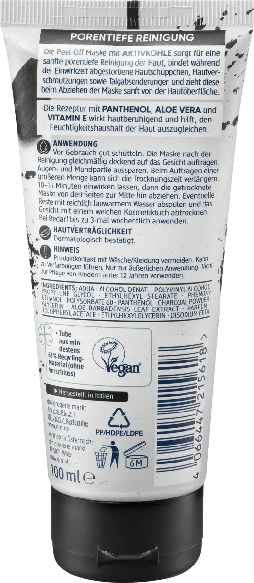 С Balea Маска-пленка Активированный уголь очищает кожу мягко и глубоко, проникая в поры. Формула с активированным углем связывает омертвевшие клетки кожи, кожные загрязнения и кожное сало во время воздействия и мягко удаляет их с поверхности кожи при снятии маски. Формула с алоэ вера, витамином Е и пантенолом оказывает успокаивающее действие на кожу и помогает сбалансировать водный баланс кожи.