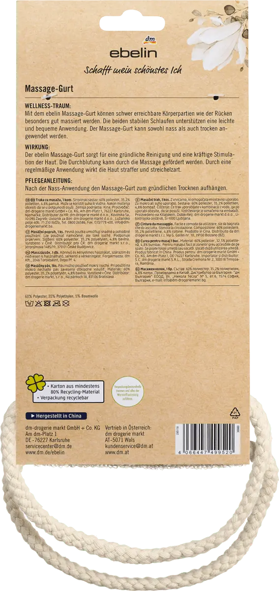 Массажный пояс от ebelin может способствовать кровообращению в коже. Благодаря дуальной структуре пояс можно использовать и для массажа труднодоступных частей тела, например спины. Две прочные петли обеспечивают простое и комфортное использование. Кроме того, массажный пояс можно использовать как в мокром, так и в сухом виде. Кожа получает мощную стимуляцию и тщательное очищение. При регулярном использовании кожа становится более упругой и мягкой. Продукт доступен в различных версиях. Цвет выбрать невозможно