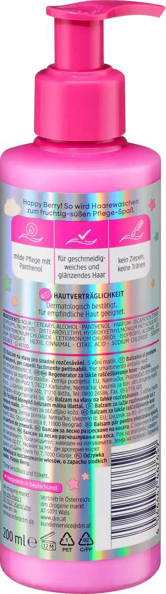 Кондиционер Happy Berry для легкого расчесывания со сладким малиновым ароматом обеспечивает фруктово-сладкий уход во время мытья. твои волосы. Кондиционер не вызывает слезотечения и слез и обеспечивает мягкий уход с пантенолом. Для эластичных, мягких и блестящих волос. Рецепт без микропластика и водорастворимых, чисто синтетических полимеров. Совместимость с кожей подтверждена дерматологически. Номер артикула dm: 344765. GTIN: 4066447467659. Состав. Вода, цетеариловый спирт, пантенол, отдушка, дикаприлиловый эфир, изопропилпальмитат, дистеароилэтилгидроксиэтилмониум метосульфат, бегентримония хлорид. , цетримония хлорид, изопропиловый спирт, бензоат натрия, гексилциннамал, лимонная кислота, хлорид натрия, сульфат натрия, CI 45100