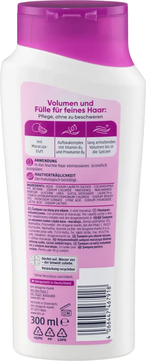 Шампунь от Balea придает объем тонким и тонким волосам. Укрепляет тонкие волосы и питает их, не утяжеляя. Строительный комплекс с витамином B3 и провитамином B5 обеспечивает эластичность и длительный объем до самых кончиков.