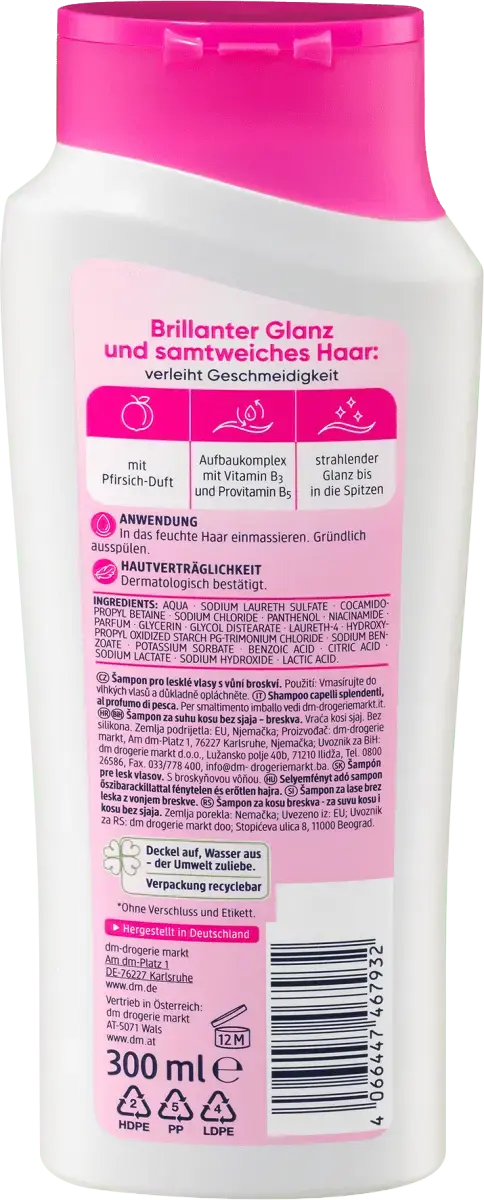Шампунь для шелковистого блеска Balea обеспечивает блестящий блеск и бархатистые мягкие волосы. Строительный комплекс с витамином В3 и провитамином В5 придает тусклым и тусклым волосам эластичность вплоть до самых кончиков. Без микропластика и водорастворимых, чисто синтетические полимеры.