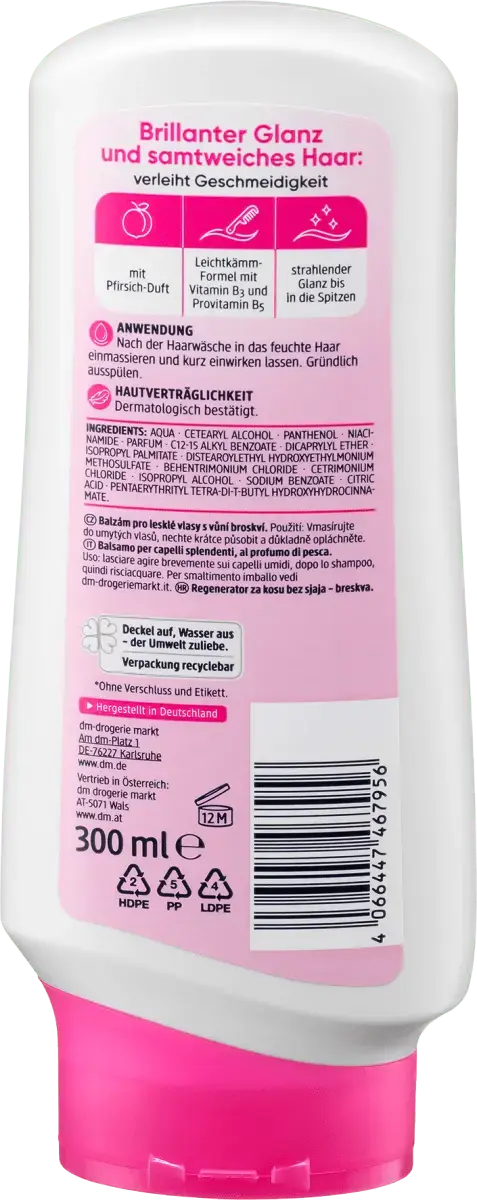 Кондиционер Balea's Silk Shine для тусклых и тусклых волос Волосы придают волосам сияющий блеск. Формула с витамином B3 и провитамином B5 обеспечивает легкое расчесывание и упругость, питание волос вплоть до самых кончиков.