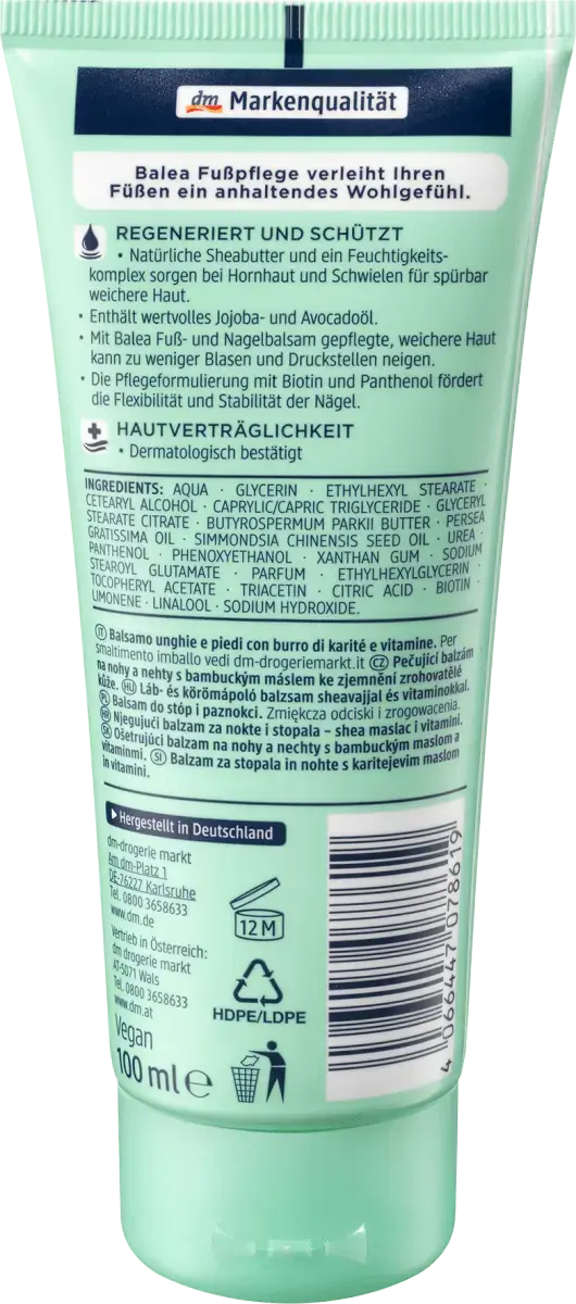 Бальзам для ног и ногтей Balea дарит вашим ногам длительное ощущение комфорта. существование. Он содержит биотин и пантенол, а также масло ши и витамины. Бальзам интенсивно питает область стоп и ногтей растительным глицерином, маслом жожоба и авокадо. Рецепт без микропластика и водорастворимых чисто синтетических полимеров.