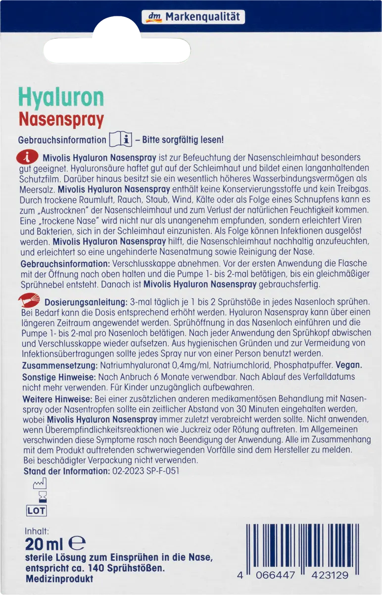 Назальный спрей Миволис Гиалурон особенно подходит для увлажнения слизистой оболочки носа. Гиалуроновая кислота хорошо прилипает к слизистой оболочке и образует долговечную защитную пленку. Кроме того, она обладает значительно более высокой водосвязывающей способностью, чем морская соль. Назальный спрей с гиалуроновой кислотой Mivolis не содержит консервантов и пропеллентов. Сухой воздух помещения, дым, пыль, ветер, холод или простуда могут привести к высыханию слизистой оболочки носа и потере естественной влаги. «Сухой нос» не только воспринимается как неприятное явление, но и способствует оседанию вирусов и бактерий на слизистой оболочке. В результате могут возникнуть инфекции. Спрей назальный с гиалуроновой кислотой Миволис способствует устойчивому увлажнению слизистой оболочки носа, облегчая беспрепятственное носовое дыхание и очистку носа.