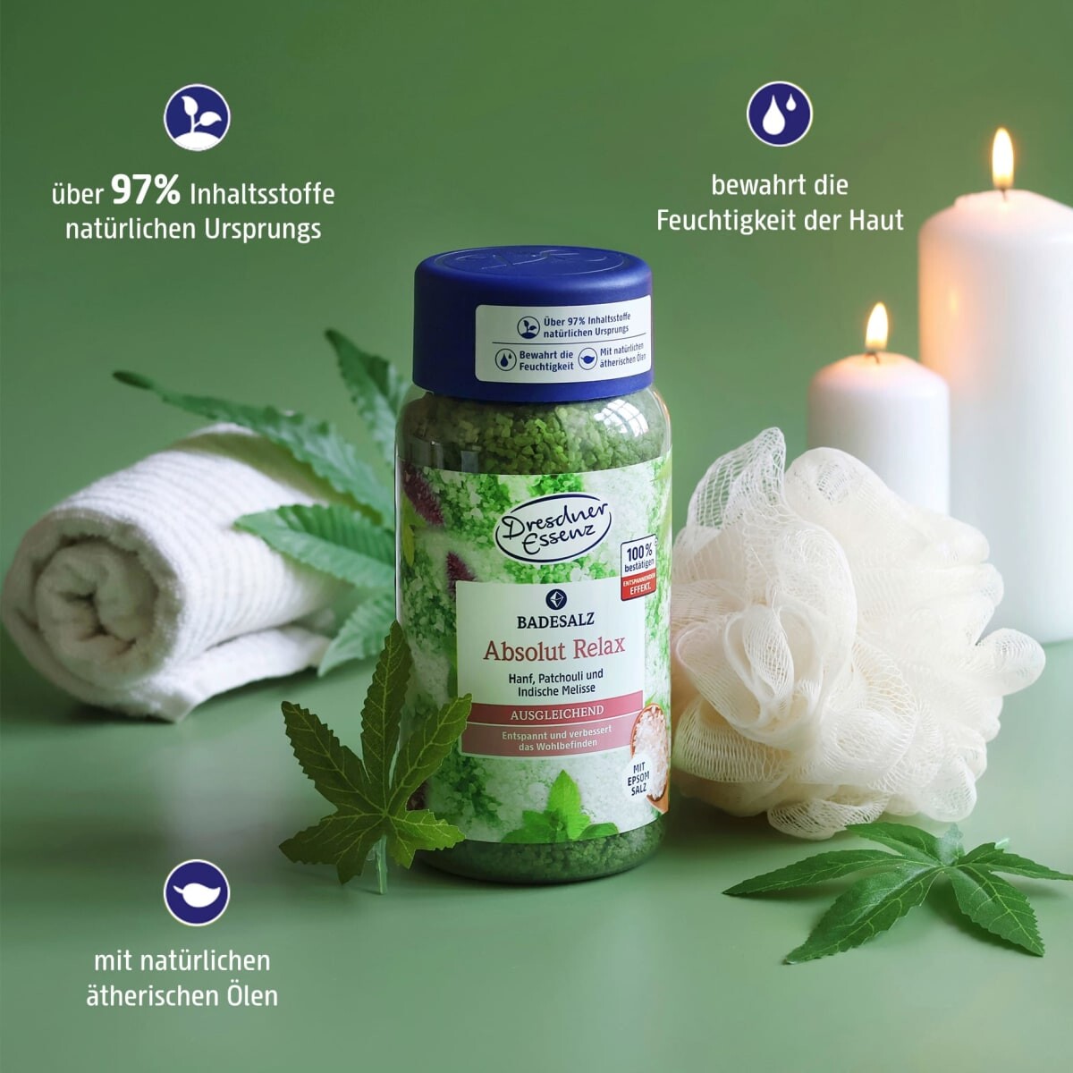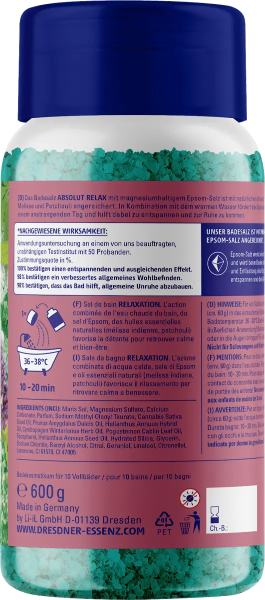 Соль для ванн Absolut Relax от Dresdner Essenz обогащена натуральными эфирными маслами индийского лимона. бальзам и пачули. Соль Эпсома имеет высокое содержание магния и помогает расслабить тело во время купания. Для приятных минут.