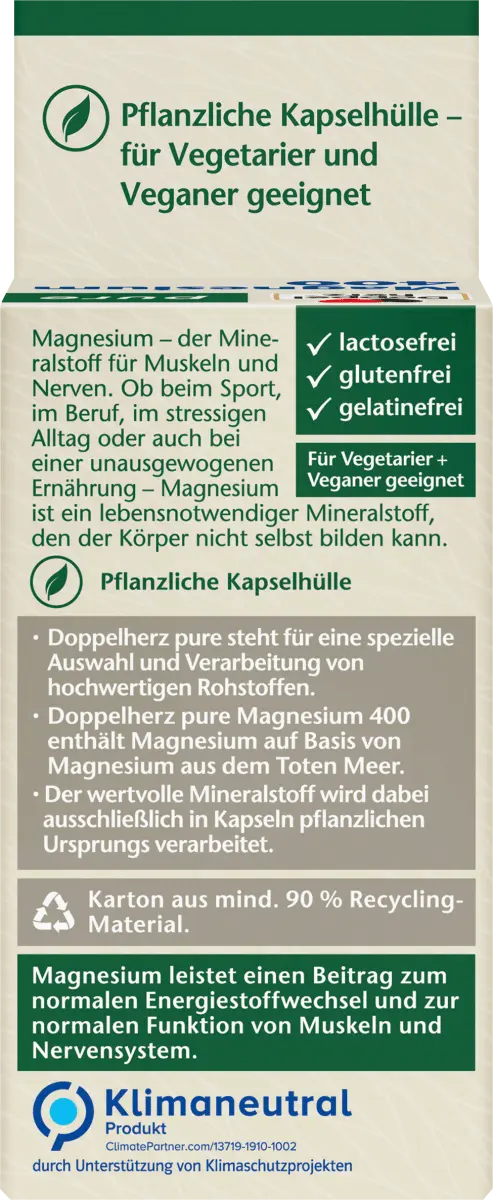 Doppelherz pure Magnesium 400 содержит магний – минерал для мышц и нервов. Будь то во время занятий спортом, на работе, в стрессовой повседневной жизни или даже при несбалансированном питании – магний – это минерал, который организм не может вырабатывать самостоятельно.