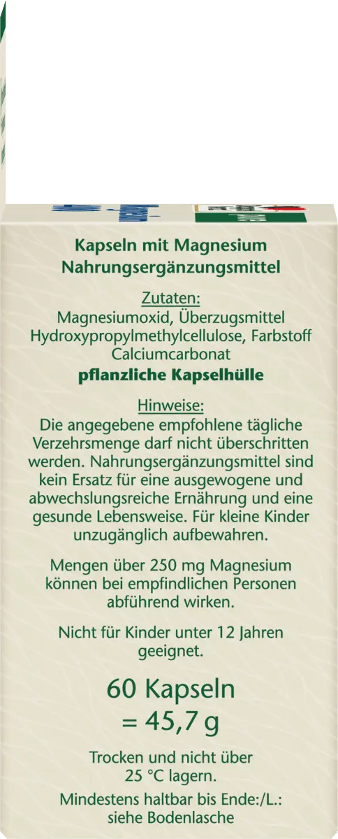 Точное название продукта: Капсулы с магнием. Пищевая добавка. Состав: оксид магния, глазирующий агент гидроксипропилметилцеллюлоза, краситель карбонат кальция. Растительная оболочка капсулы. Пожалуйста, обратите внимание на информацию об аллергенах.