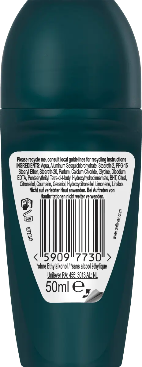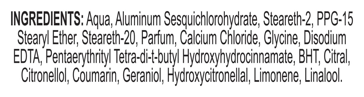 Состав: вода, сесквихлоргидрат алюминия, стеарет- 2, PPG-15 стеариловый эфир, стеарет-20, отдушка, хлорид кальция, глицин, динатрий ЭДТА, пентаэритритилтетра-ди-т-бутилгидроксигидроциннамат, BHT, цитраль, цитронеллол, кумарин, гераниол, гидроксицитронеллаль, лимонен, линалоол.