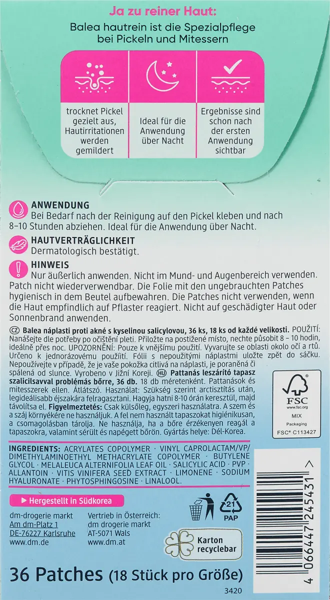 Патчи Skin Clean Anti-Pimple от Balea – практичный помощник для целенаправленного подсушивания прыщей и черных точек. Прозрачные патчи с салициловой кислотой оказывают антибактериальное и успокаивающее кожу действие. Быстрый и простой в использовании, идеален на ночь. Веган.