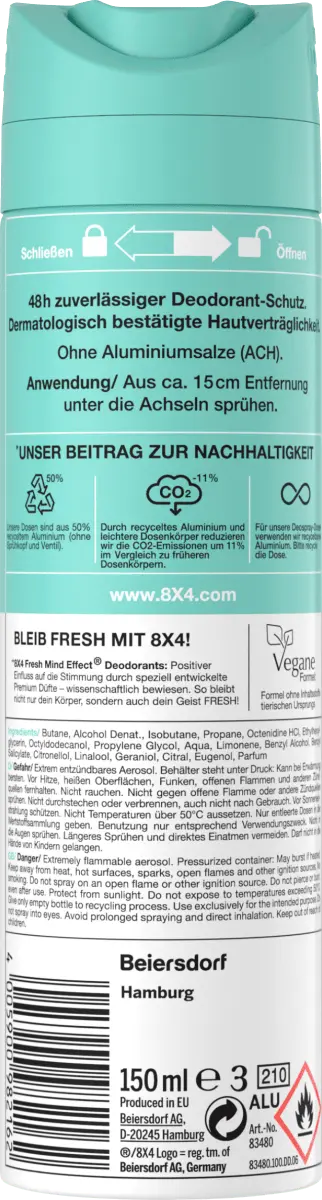 С освежающих, пикантных цитрусовых нот от женщин 8x4 Дезодорант-спрей Дезодорант № 7 Fresh Lime может начать день. Дезодорант-спрей раскрывает весь свой потенциал благодаря сочетанию активирующего аромата и надежной 48-часовой защиты.
