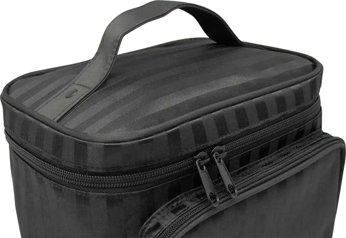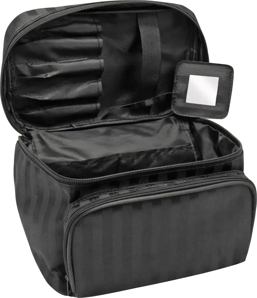 Эта стильная косметичка черного цвета привлекает внимание своим полосатым узором. Он предлагает просторное пространство для хранения, разделенное на основное отделение с двумя внутренними отделениями, пять дополнительных внутренних отделений с фиксирующим ремнем для кистей или кистей в крышке и большой передний карман. В чемодане также имеется зеркало и практичная ручка для переноски.
