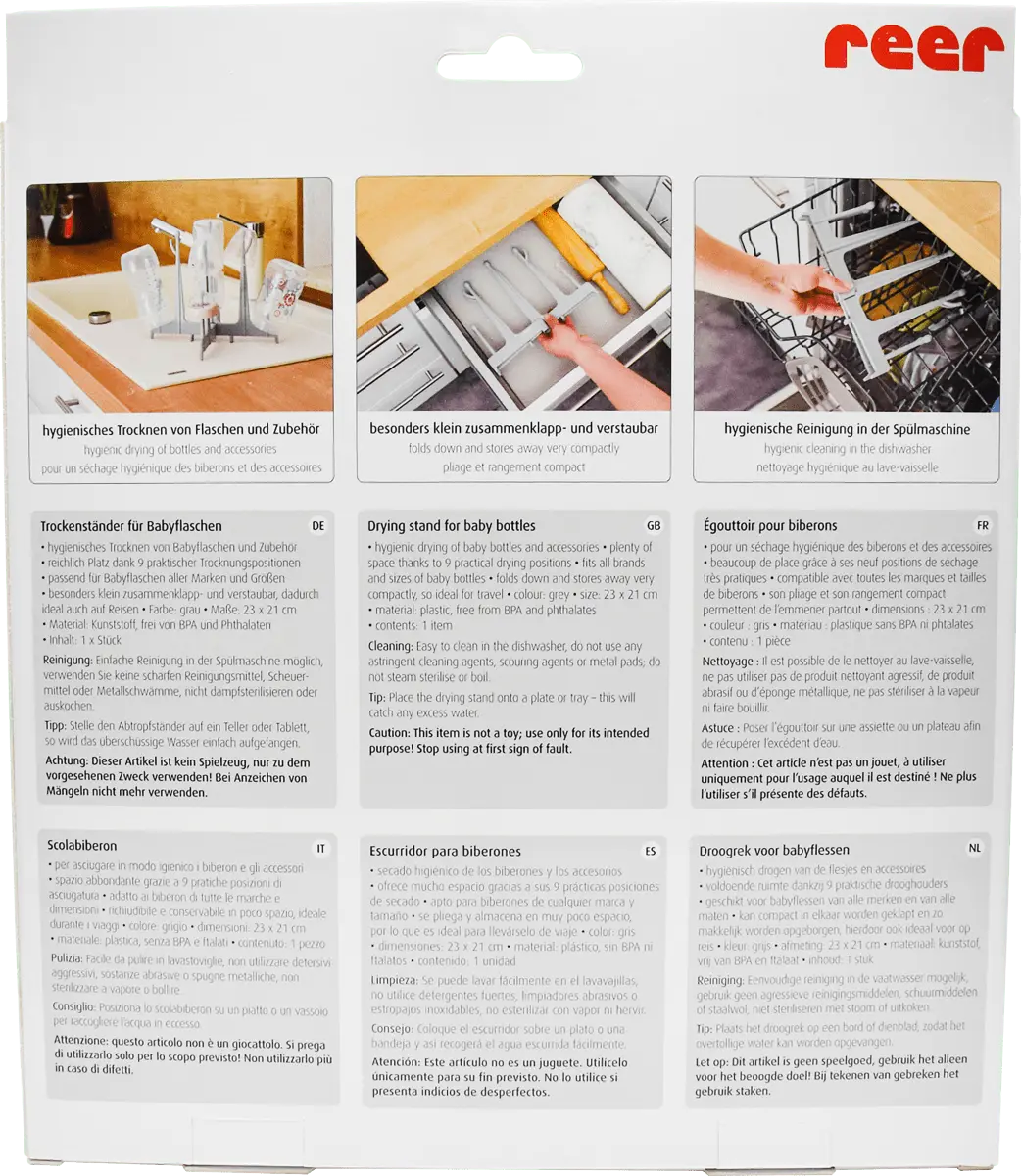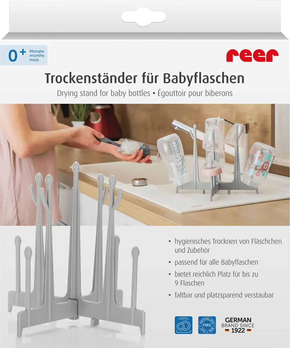Серая сушилка для бутылочек от Reer – настоящий must-have для родителей. Места достаточно благодаря девяти различным положениям для сушки. Его также можно сложить и убрать, что делает его идеальным для путешествий.