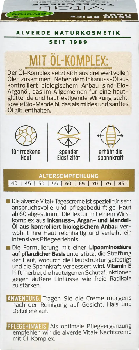 Дневной крем alverde Vital + специально разработан для очень требовательная и нуждающаяся в уходе кожа старше 60 лет. Текстура с активным комплексом, полученным из контролируемых органических культур, нежно ухаживает за вашей кожей и обеспечивает интенсивный уход. Формула с липоаминокислотами растительного происхождения поддерживает подтяжку кожи, что укрепляет ее структуру и повышает эластичность. Витамин Е помогает усилить собственные защитные функции кожи от внешних воздействий, таких как свободные радикалы. Применение: Нанесите крем на лицо, шею и зону декольте утром после очищения. Рекомендации по уходу: Мы рекомендуем ночной крем Alverde Vital+Night с масляным комплексом в качестве оптимальной добавки для ухода. Рецепт без микропластика и водорастворимых, чисто синтетических полимеров.