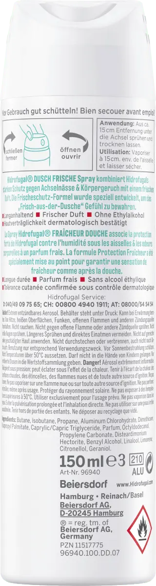 Дезодорант-спрей Hidrofugal «Свежесть для душа» обеспечивает ощущение свежести после душа, приятная свежесть. . Обеспечивает надежную защиту от влаги в области подмышек и запаха тела, а также имеет освежающий аромат.