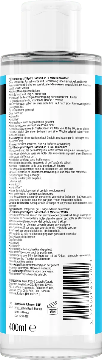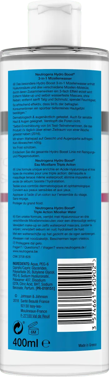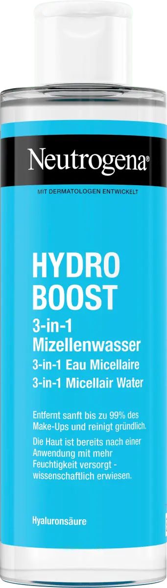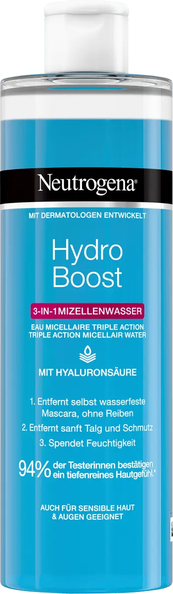 Мицеллярная жидкость Neutrogena Hydro Boost 3-в-1 вода содержит гиалуроновую кислоту и 3 разные молекулы мицелл, которые вместе обеспечивают тройной эффект: удаляют макияж и даже водостойкую тушь, не втирая. Он мягко удаляет кожный жир и грязь и увлажняет гиалуроновой кислотой. Он также подходит для чувствительной кожи и глаз.